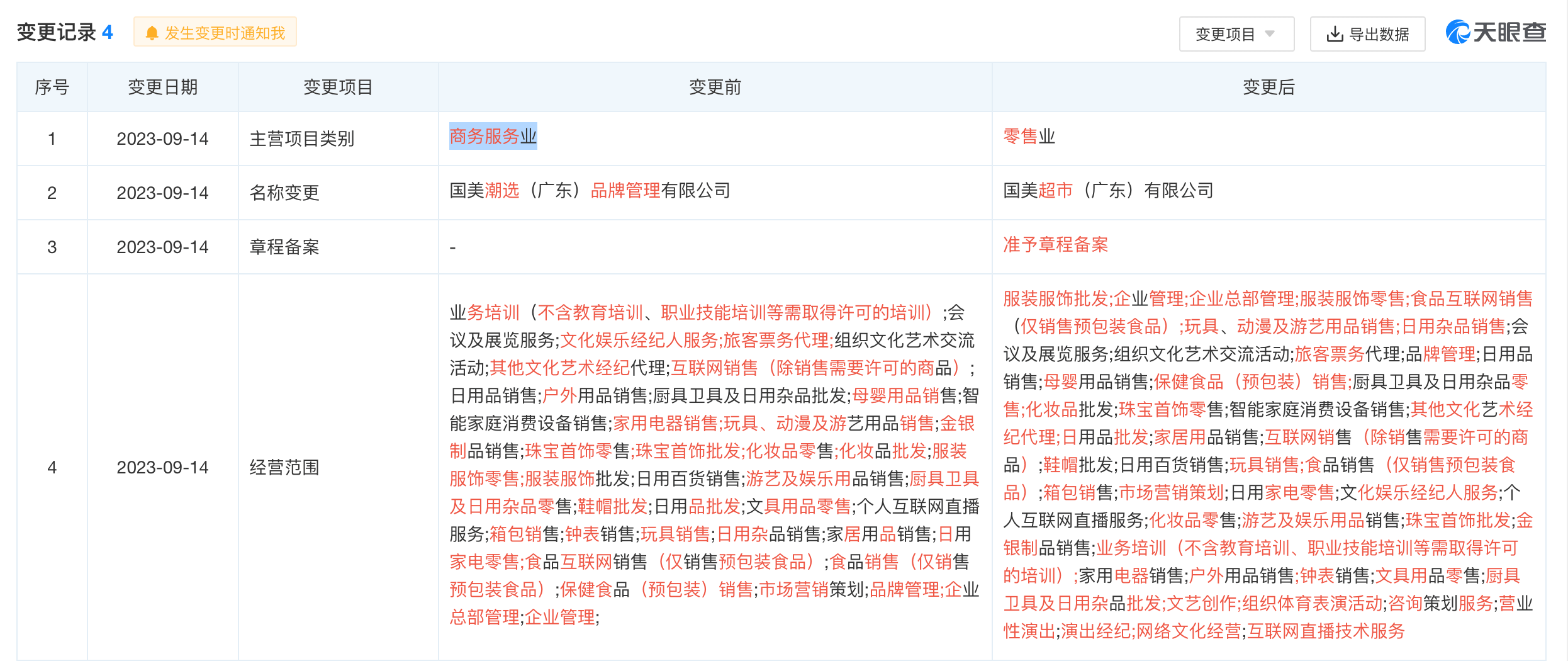 据天眼查显示,国美超市(广东)有限公司是国美控股集团旗下品牌,成立于2023年,注册资本为500万元,法定代表人为刘磊,是一家以从事零售业为主的企业。经营范围主要包括服装服饰、日用杂品、母婴用品、家用电器等。该公司于今年9月变更主营项目类别、名称以及经营范围等,从商务服务业变更为零售业,从“国美潮选(广东)品牌管理有限公司”变更为“国美超市(广东)有限公司”。
