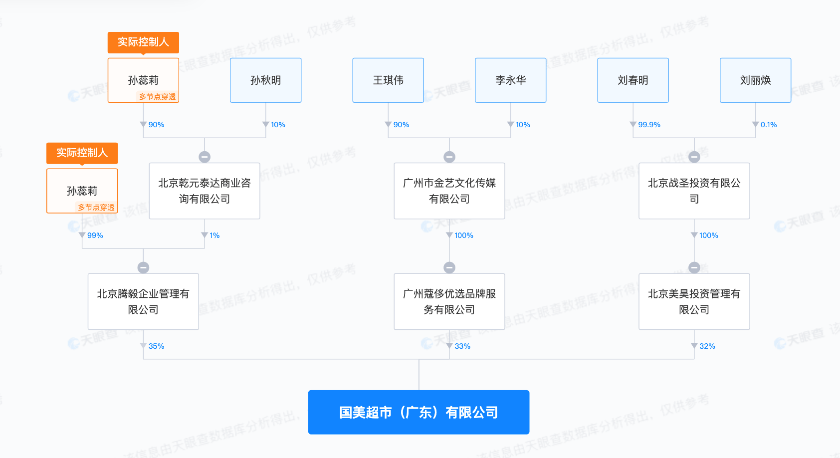 国美超市董事长吴茜在国美系多家企业担任股东和高管,包括国美通讯设备股份有限公司、天津国美股权投资管理有限公司、北京国美物联科技有限公司等。从股东信息来看,国美超市三个股东分别为北京腾毅企业管理有限公司、广州蔻侈优选品牌服务有限公司以及北京美昊投资管理有限公司,持股比例分别为35%、33%以及32%。