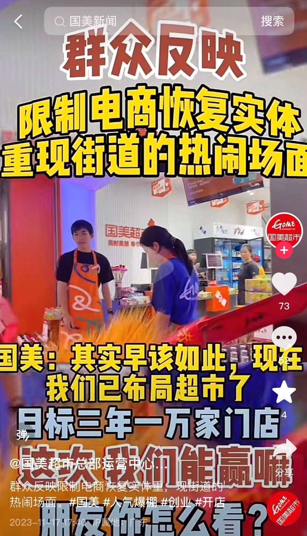 国美超市官方抖音账号也在近日发布多条视频,内容包括“国美绝地反击,国美超市开业人潮汹涌,全国大量开店铺开实体超市”等。此外,还有认证为国美超市总部运营中心的账号发布视频称,“国美重仓实体”,“国美布局超市,目标三年一万家门店”等相关信息。