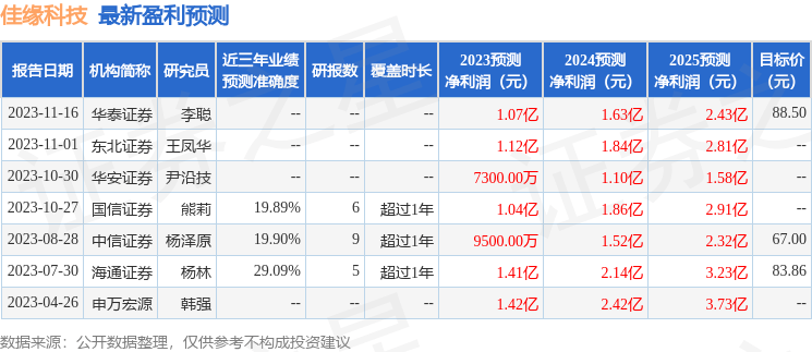 佳缘科技2023年三季报显示,公司主营收入1.86亿元,同比上升15.1%;归母净利润3232.11万元,同比下降11.75%;扣非净利润2662.65万元,同比上升9.79%;其中2023年第三季度,公司单季度主营收入5671.53万元,同比上升330.9%;单季度归母净利润479.81万元,同比上升178.71%;单季度扣非净利润350.89万元,同比上升135.43%;负债率5.03%,投资收益617.25万元,财务费用-540.02万元,毛利率59.84%。