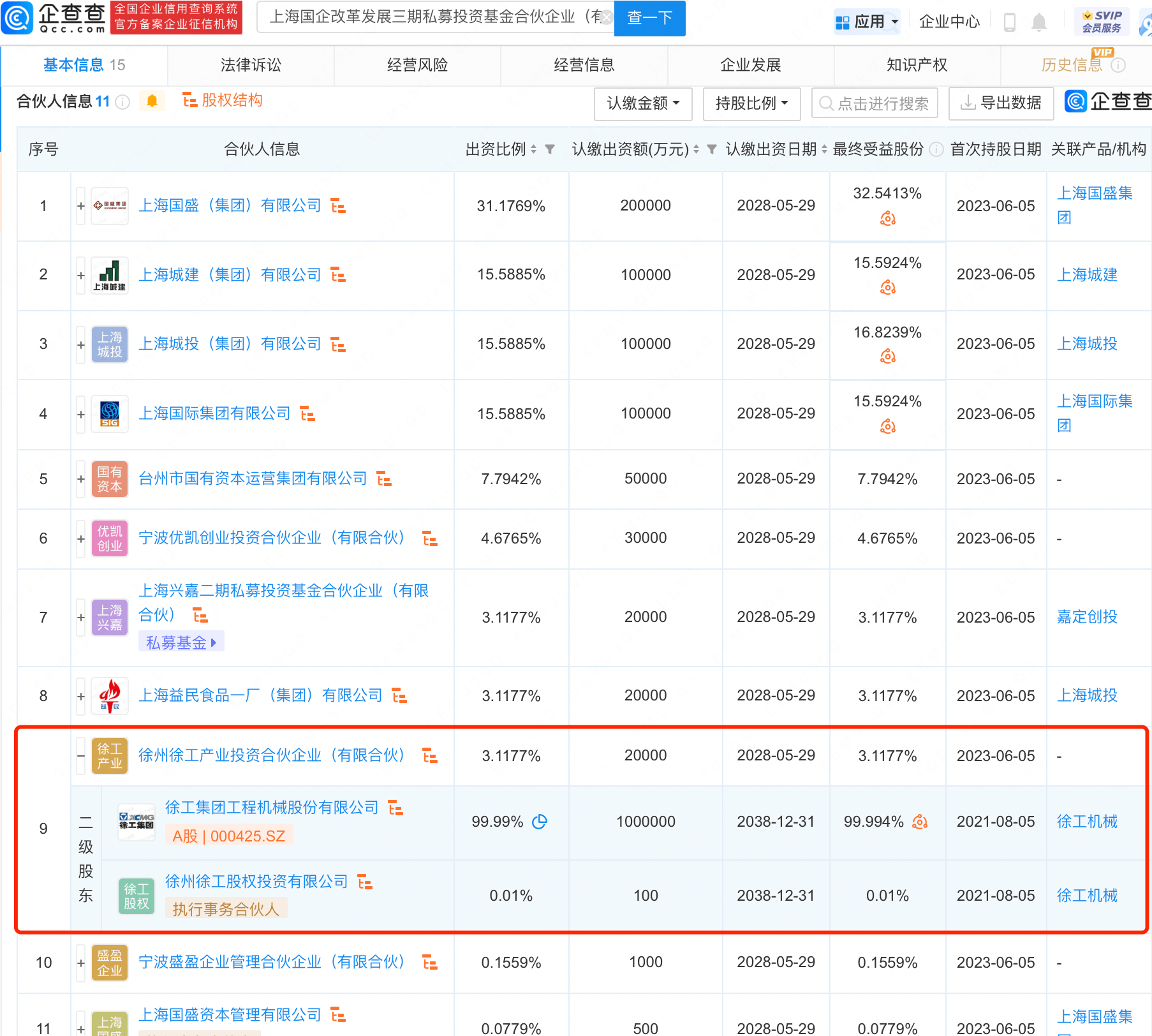 企查查APP显示,上海国企改革发展三期私募投资基金合伙企业(有限合伙)成立,执行事务合伙人为上海国盛资本管理有限公司,注册资本64.15亿元人民币,经营范围包含:以私募基金从事股权投资、投资管理、资产管理等活动。企查查股权穿透显示,该公司由徐工机械(000425)控股企业徐州徐工产业投资合伙企业(有限合伙)等共同持股。