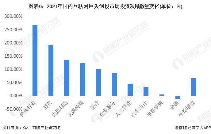 具体看各领域的投资数量变化来看,2021 年互联网巨头在各领域投资数量除金融领域外都有明显的增长。其中,在传统行业、消费、先进制造、文娱传媒和医疗领域,机构投资数量增幅都较大,均超过 100%。