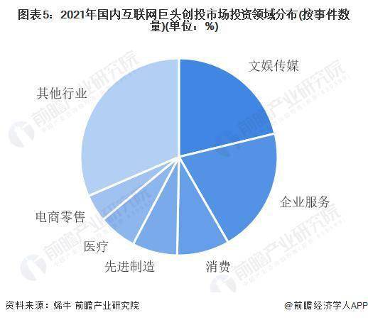 从我国互联网巨头在创投市场投资领域分布来看,2021 年我国互联网巨头主要投资分布在文娱传媒、企业服务和消费三大领域,三大领域投资事件数量合计占比近 50%。其中,文娱传媒领域投资占比约 21%,是互联网巨头企业 2021 年最关注的投资领域。