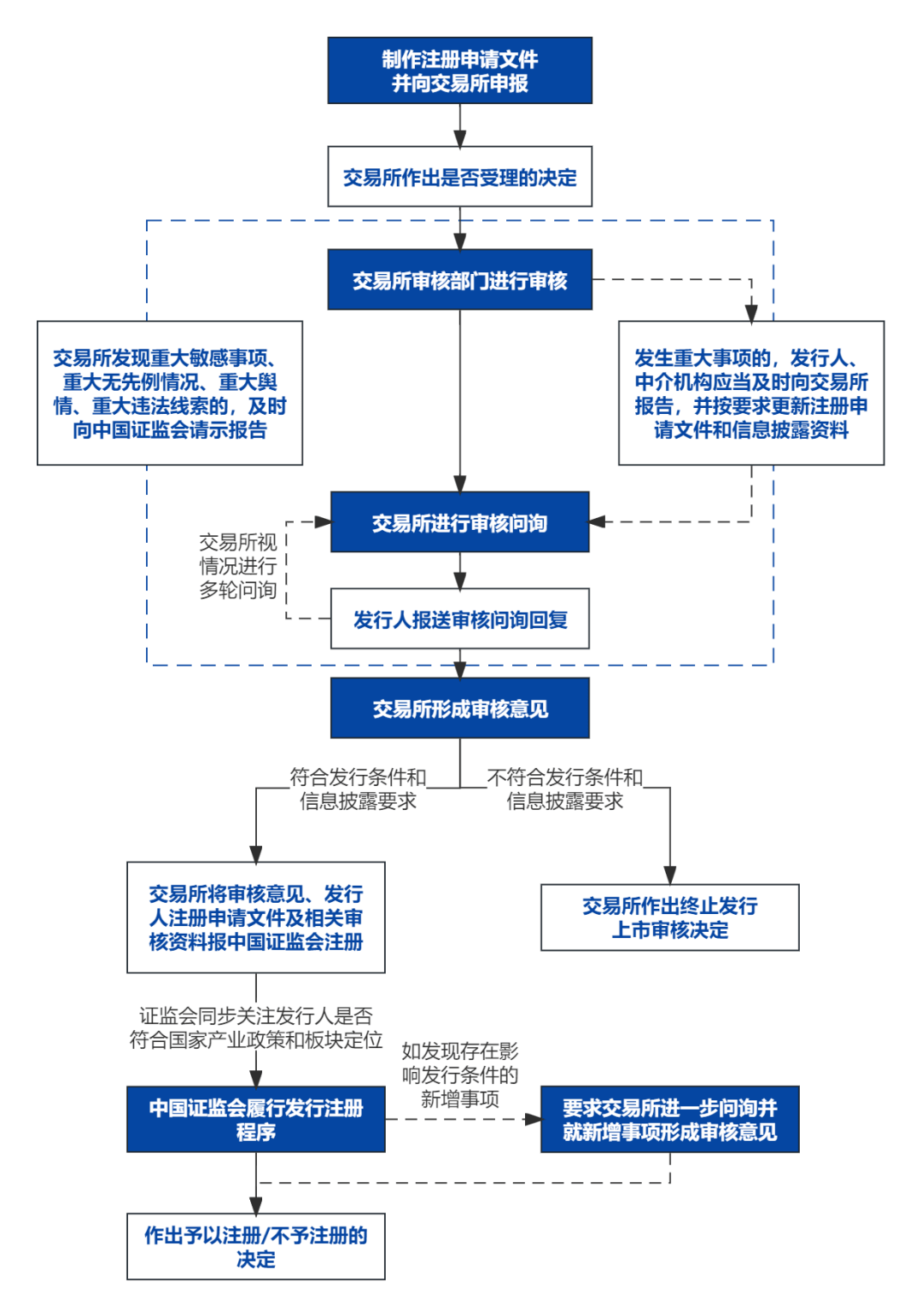 全面实行注册制后,交易所全面负责各拟上市主体发行上市和信息披露要求的审核,中国证监会基于交易所审核意见依法履行注册程序。首发上市新规建立了中国证监会对交易所发行上市审核工作的监督机制及交易所对中国证监会的重大事项报告机制。需要特别关注的是,针对发行人是否符合各板块定位的问题,根据《首发办法(意见稿)》规定,中国证监会在证券交易所收到注册申请文件之日起,就会同步关注发行人是否符合国家产业政策和板块定位。
