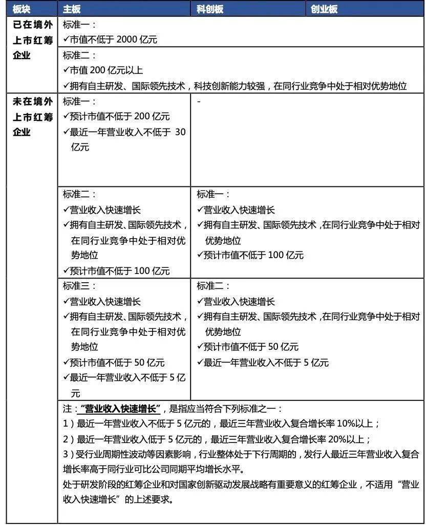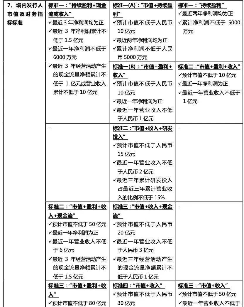 3.各板块均允许红筹企业申请首次公开发行股票或者存托凭证并上市,除应满足上表1中第1-6项的主要实质条件外(其中第5条、第6条实质条件中关于“股本总额”的规定,可改为按照股份总数或存托凭证总份数为标准适用),该等红筹企业的市值及财务指标应当至少符合下列标准中的一项: