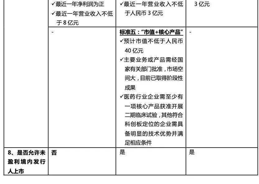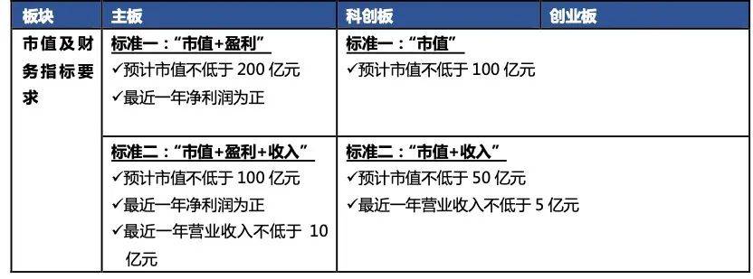 2.各板块均允许发行人设置表决权差异安排,发行人具有表决权差异安排的,除应满足上表1中第1-6项的主要实质条件外,其市值及财务指标应当至少符合下列标准中的一项: