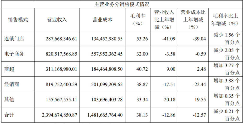 负面影响直接反映在了财报数据中,2022年第二季度的营收同比2021年减少5.03亿,下降幅度达25%。经销商、连锁门店、电商等渠道的销售额均出现下滑,其中连锁门店降幅甚至达到了41%。