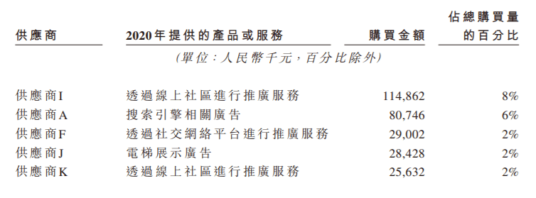 还值得一提的是,在雍禾医疗的招股书中,其罗列出来的前五大供应商均为广告服务提供商,所提供的广告渠道包括线上社区、搜索引擎、网络社交平台和电梯展示。