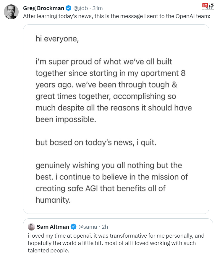 IT之家 11 月 18 日消息,OpenAI 宣布 CEO 兼联合创始人萨姆・阿尔特曼(Sam Altman)离职数小时后,总裁兼联合创始人格雷格・布罗克曼(Greg Brockman)在 X 发文宣布,“根据今天的消息,我辞职了。”