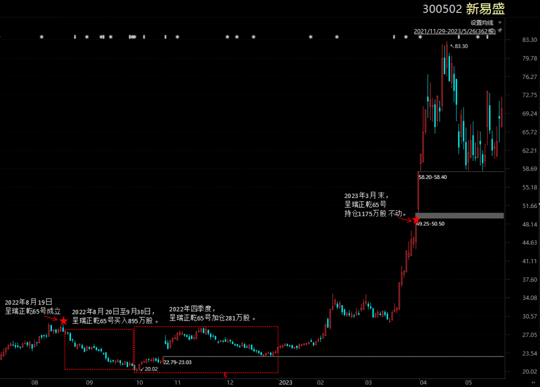 上海呈瑞投资管理有限公司(以下简称“呈瑞投资”)旗下呈瑞正乾65号私募基金(以下简称“呈瑞正乾65号”)于2022年三季度买入新易盛895万股,位列新易盛第六大流通股股东;在四季度加仓280万股,至1175万股,并持有至2023年一季度末。