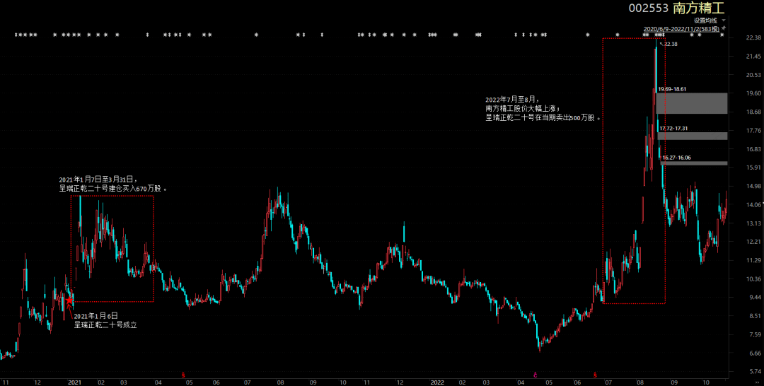 南方精工(002553.SZ)曾在2020年11月至2021年1月、2022年6月至8月出现两次暴涨,而呈瑞投资旗下的呈瑞正乾二十号私募基金(以下简称“呈瑞正乾二十号”)曾在2021年一季度新进,买入670万股, 此次建仓时间正对应其第一轮暴涨。