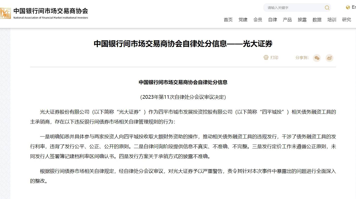 根据银行间债券市场相关自律规定,经自律处分会议审议,交易商协会对光大证券予以严重警告,责令其针对本次事件中暴露出的问题进行全面深入的整改。