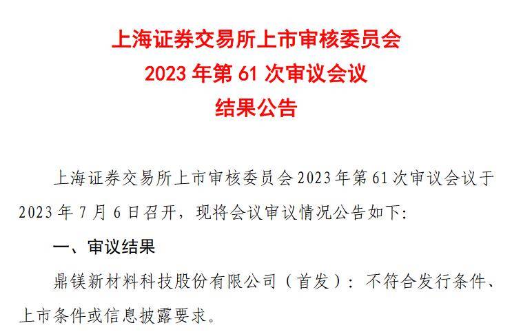 中新经纬7月6日电 6日,上交所上市委公告,鼎镁科技主板IPO审议结果为:不符合发行条件、上市条件或信息披露要求。这是A股实施全面注册制后,首个主板IPO被否的公司。