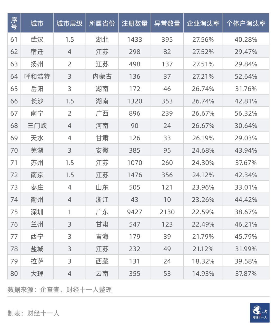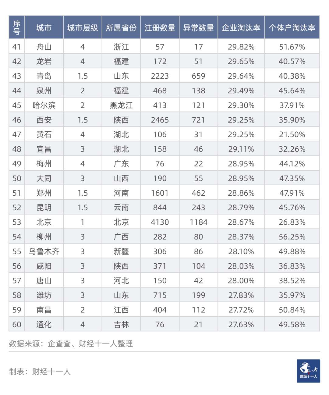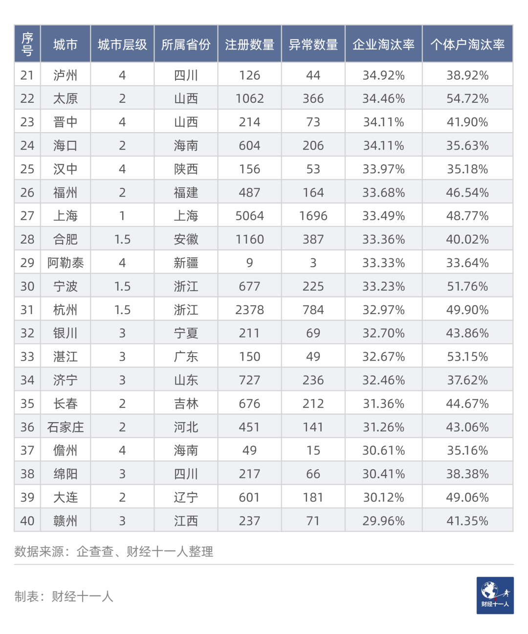 第三,个体户淘汰率高的城市,企业淘汰率也较高;个体户淘汰率低的,企业也低。