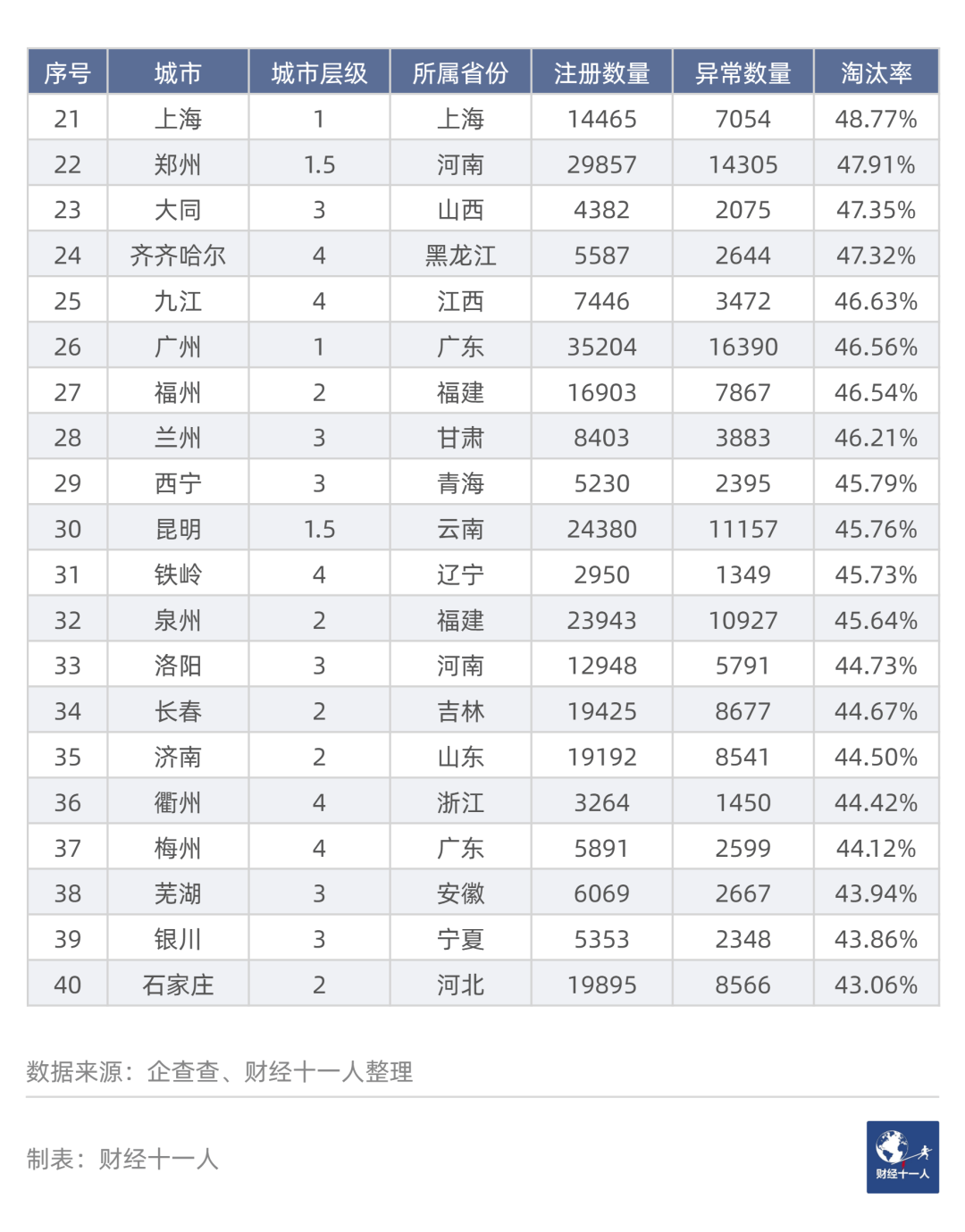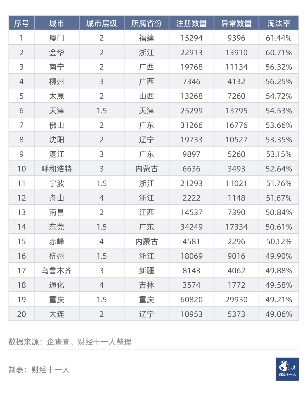 在表3中,注册数量高于2.1万的城市有25个,其中24个处于淘汰率最高或次高区域,占比96%。例如,淘汰率第2名金华注册数量为2.89万,第3名东莞注册数量为4.63万。