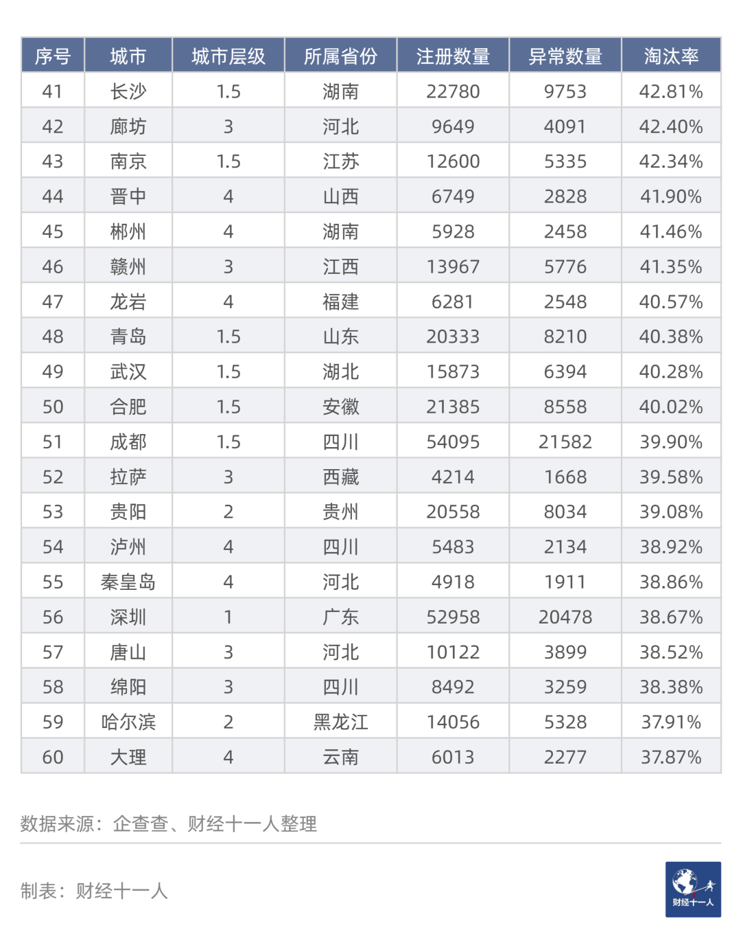 表4中,在26个注册数量最高的城市中,18个城市的“3年淘汰率”属于最高区域或次高区域,占比69.2%。