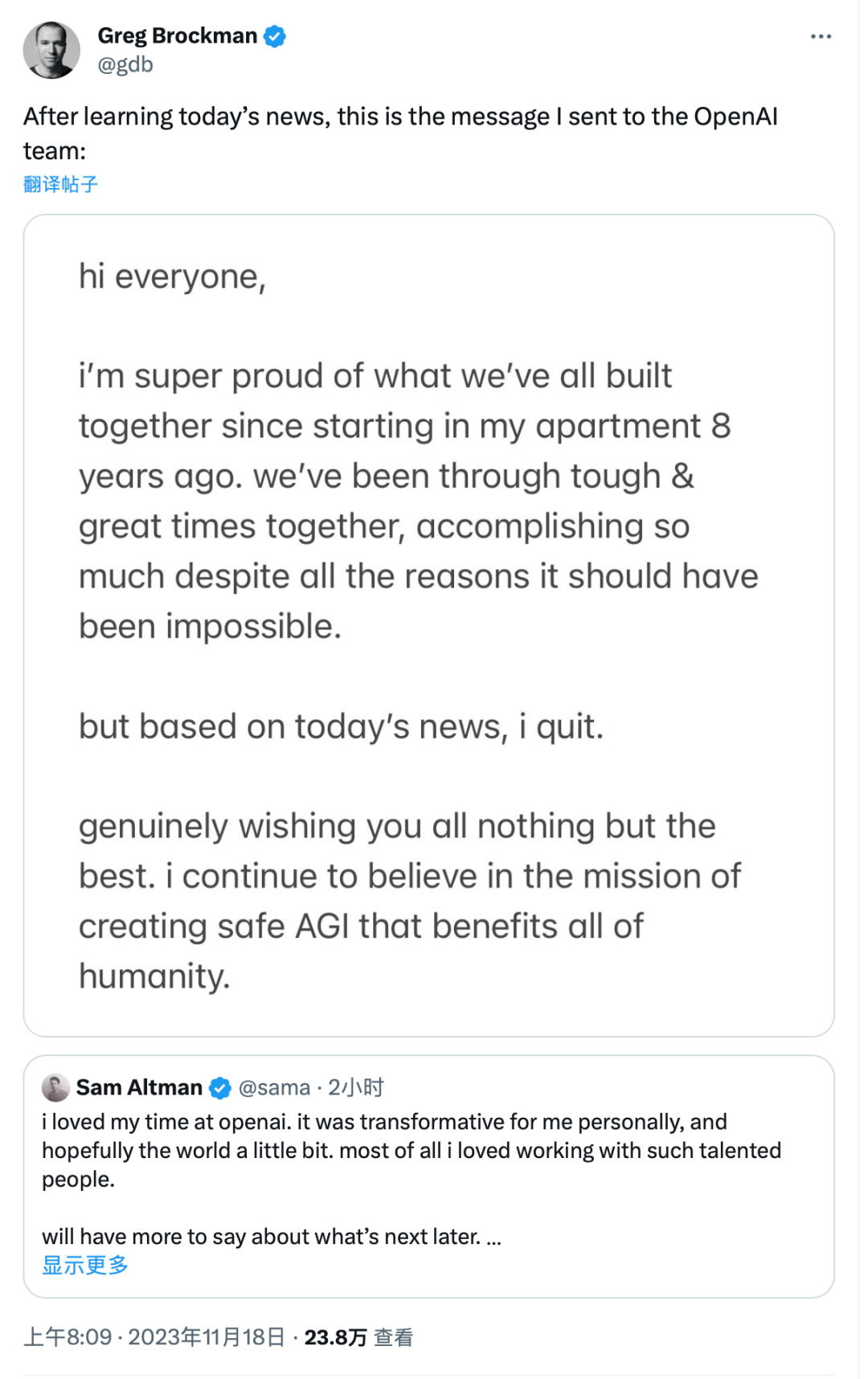 在被罢免后,有“ChatGPT之父”称号的奥特曼在X(原推特)平台上发文称:“我很喜欢在openai 的时光。这对我个人来说是变革性的,希望对世界也有一点变革。最重要的是,我喜欢与这些才华横溢的人一起工作。稍后将有更多关于接下来的事情要说。”