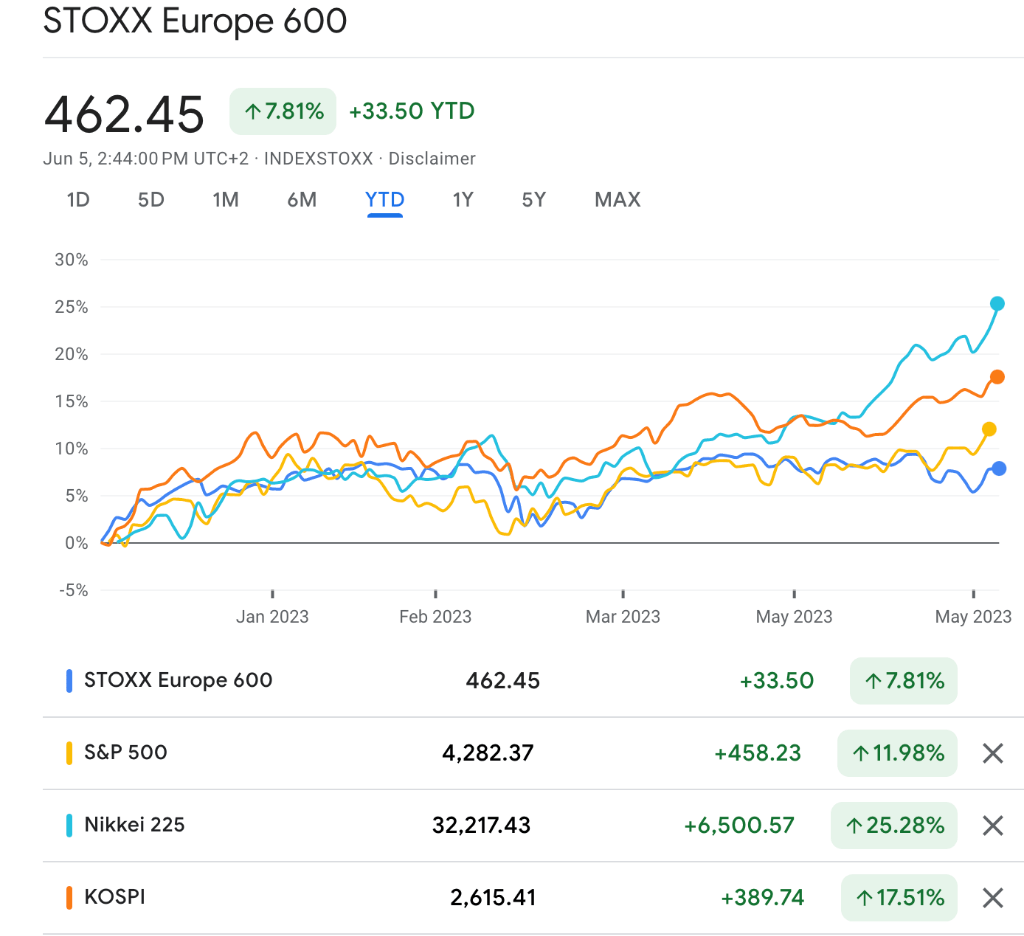 今年年初至今,日本股市和韩国股市先后步入牛市,日经225指数累涨超25%,站上32000点的历史高位;韩国KOSPI指数累涨超17%;欧洲Stoxx600指数涨近8%,不及标普500近12%的涨幅