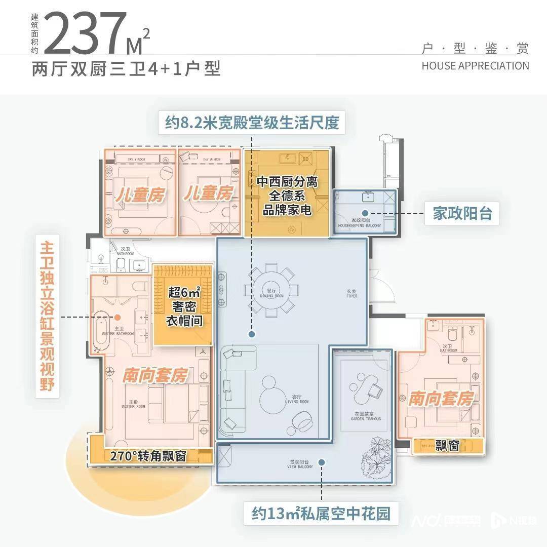 建面约237㎡的户型产品,四开间朝南,南北通透,可容纳三代同堂的欢声笑语。LDK一体化设计的餐客厅,面宽约8.2米,搭配“L”形私属空中花园,盛放生活万千想象。