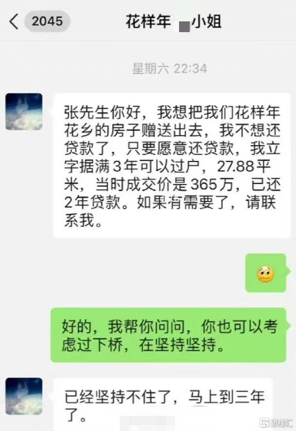 虽然消息有待验证,但从流传出的对话来看,业主是高位买入花样年花乡后开始扛不住,打算免费送房,只要接手的人愿意还房贷就行。