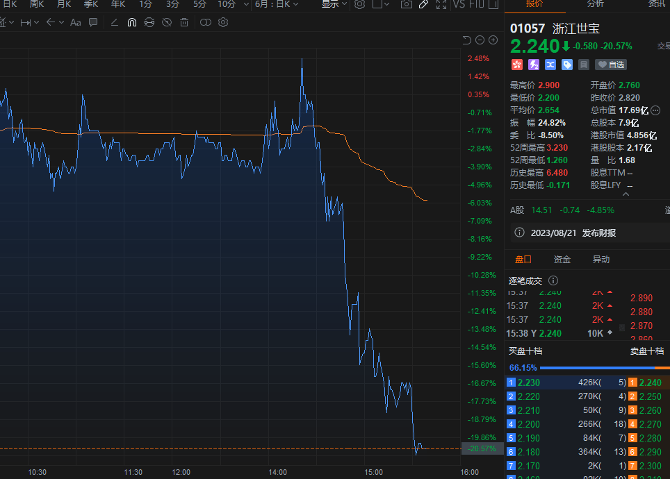 原标题:浙江世宝H股跌超20% 成交逾3亿港元