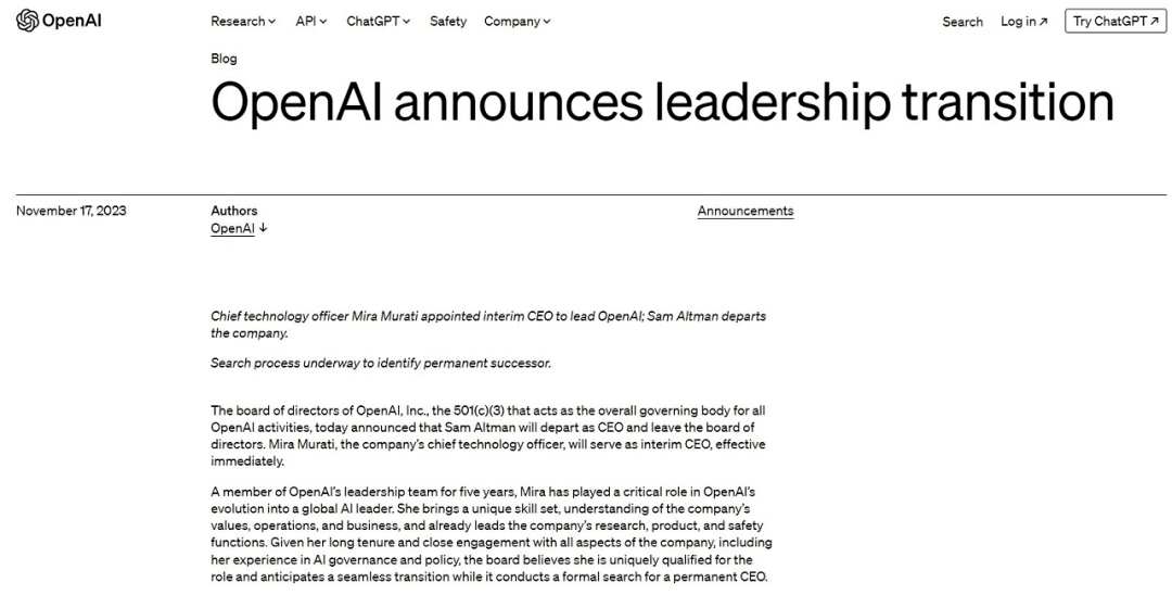 OpenAI董事会在一份声明中表示,“OpenAI是为推进我们的使命而特意组建的:确保人工通用智能造福全人类。董事会将继续全心全意地履行这一使命。我们感谢奥特曼为OpenAI 的创立和发展做出的诸多贡献。同时,我们认为,在我们前进的过程中,新的领导层是必要的。作为公司研究、产品和安全职能部门的领导者,米拉•穆拉蒂非常有资格担任临时CEO一职。我们对她在过渡时期领导OpenAI的能力充满信心。”