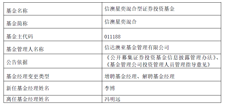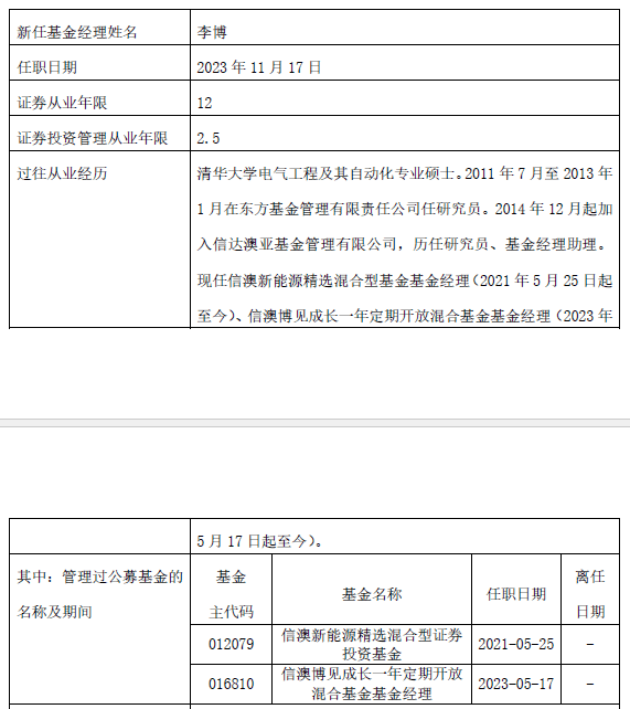 信澳星奕的新任基金经理是李博。李博从今年开始单独管理基金,目前在管产品还有信澳新能源精选、信澳博见成长一年定开。简历显示,李博2011年7月至2013年1月在东方基金任研究员,2014年12月起加入信达澳亚基金,历任研究员、基金经理助理。