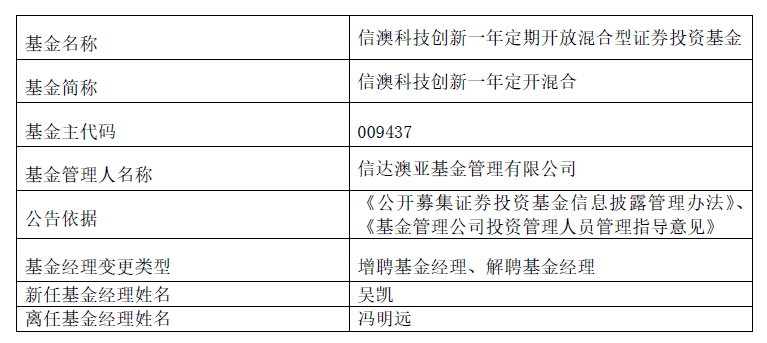11月18日,信达澳亚基金公告称,冯明远自11月17日不再担任信澳星奕、信澳科技创新一年定开的基金经理。今年1月13日,冯明远卸任信澳匠心臻选两年持有;2月3日,卸任信澳先进智造;2月16日,又卸任信澳核心科技。