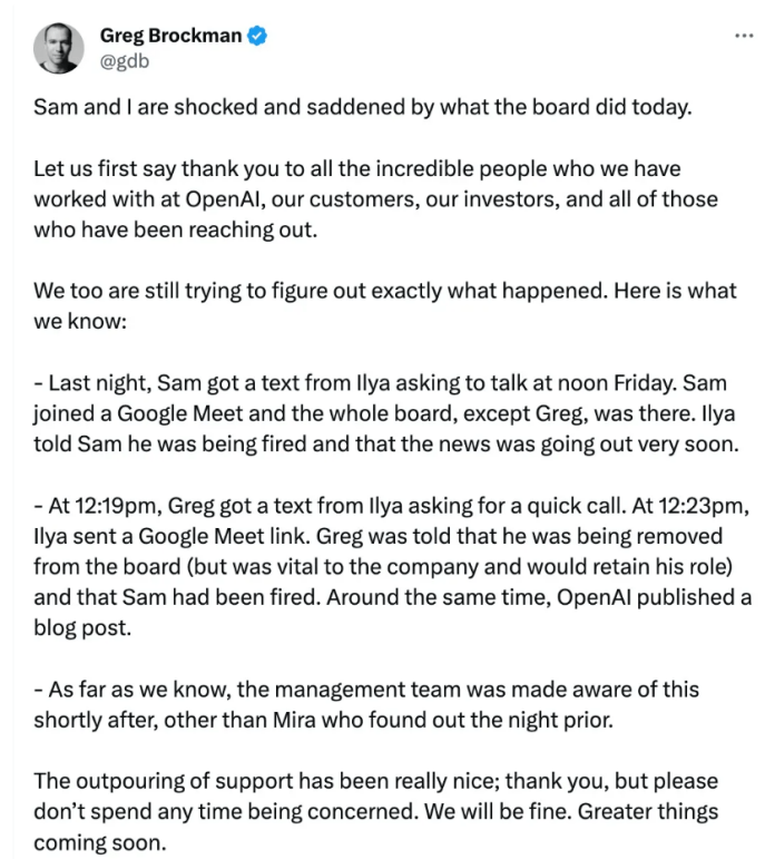 格雷格写道:“昨晚,山姆收到伊利亚的短信,要求在周五中午进行交谈。山姆加入了 Google Meet,除了格雷格之外,整个董事会都在场。伊利亚告诉山姆他被解雇了,这个消息很快就会传出去。12:19pm,格雷格收到伊利亚的短信,要求进行一个快速的电话。12:23pm,伊利亚发送了一个 Google Meet 的链接。格雷格被告知他将被从董事会中撤职(但由于他对公司至关重要因此将保留他的职位,于此同时山姆要被解雇)。大约在同一时间,OpenAI 发布了一篇博客文章。据我们所知,管理团队在此之后不久就得知了这个消息,除了在前一晚得知的米拉之外。”