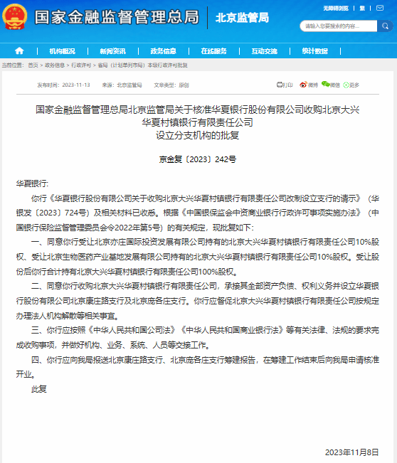 同时,批复显示,同意华夏银行设立华夏银行北京康庄路支行及北京庞各庄支行,并要求华夏银行督促北京大兴华夏村镇银行按规定办理法人机构解散等相关事宜。