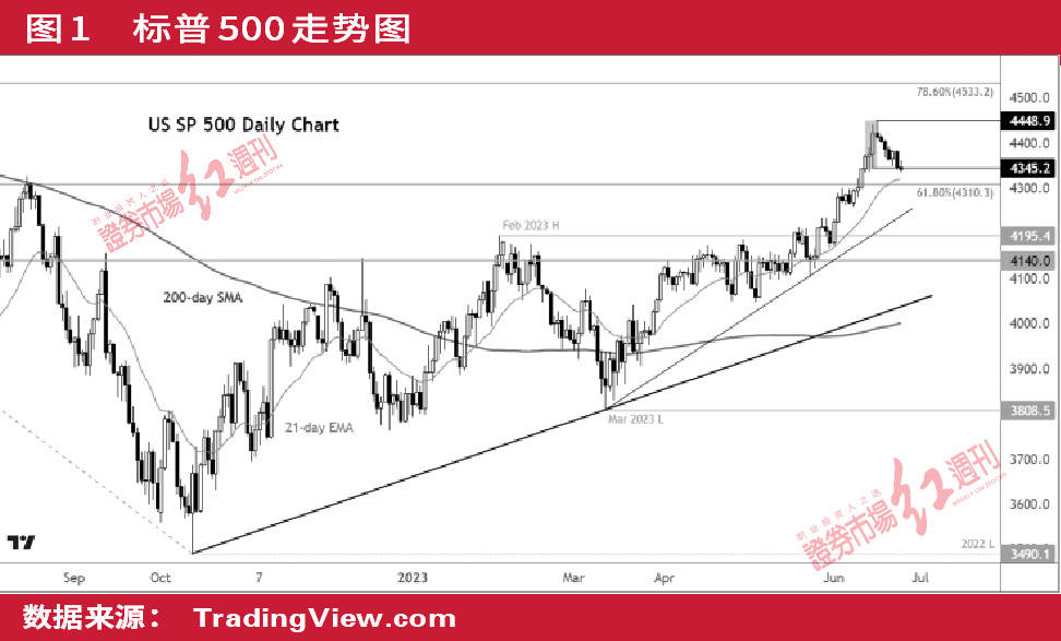 上周,标普500指数结束了连续五周的上涨势头。由于技术性抛售和黯淡的宏观前景,多头在本周初保持观望,指数进一步回调的风险增加。因此,我们对标普500指数的短期预测保持看跌走向。此次抛售的原因是担心央行在经济数据恶化之际采取过度紧缩政策。如果未来通胀数据凸显出对黏性通胀的担忧,加息概率则可能进一步上升。
