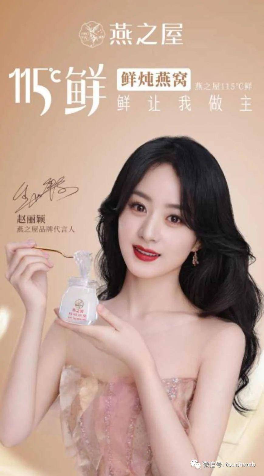 燕之屋还曾官宣全品牌代言人——演员赵丽颖,视频中,赵丽颖手持产品115℃鲜·燕之屋鲜炖燕窝登场,展现清新淡雅、鲜活向上的气质。