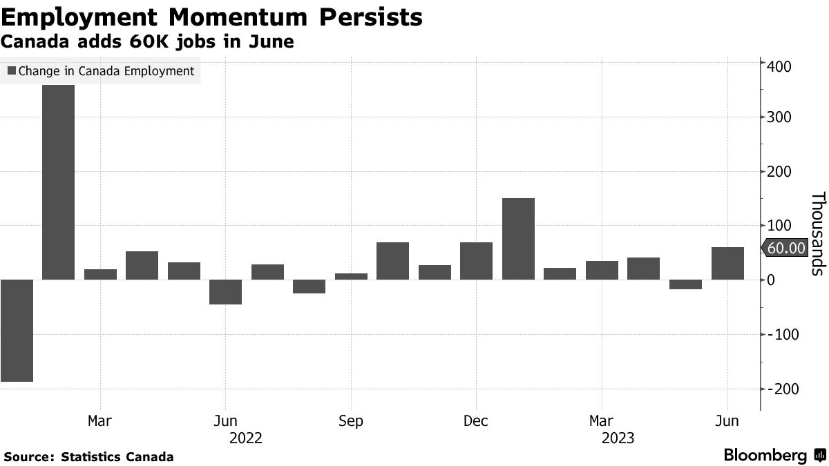 6月份强劲的数据表明,5月份减少17300个就业岗位只是暂时的疲软,尽管就业岗位增加的同时,工资涨幅放缓至3.9%,为一年来的最低水平,但这仍表明,利率上调了450个基点后,加拿大经济仍在创造就业机会,因此加拿大央行可能仍将继续收紧货币政策。