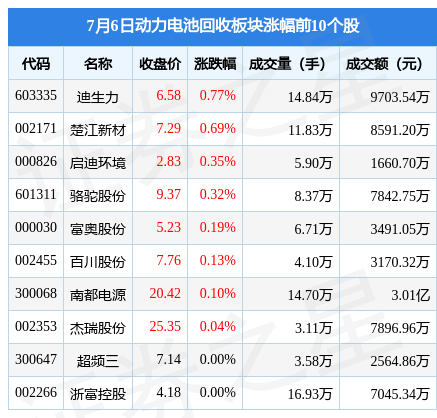 从资金流向上来看,当日动力电池回收板块主力资金净流出7.74亿元,游资资金净流出229.02万元,散户资金净流入7.76亿元。动力电池回收板块个股资金流向见下表: