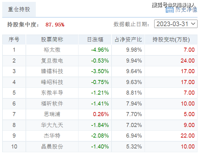 该基金的十大持仓中裕太微-U、臻镭科技跌幅较大,其余个股属于芯片方向,也有一定的跌幅,前十大持仓占总持仓82.92%,持股集中度:87.95%,基金净值相对跑输市场(半导体类主动型混合基金)【基金规模0.88亿元】。