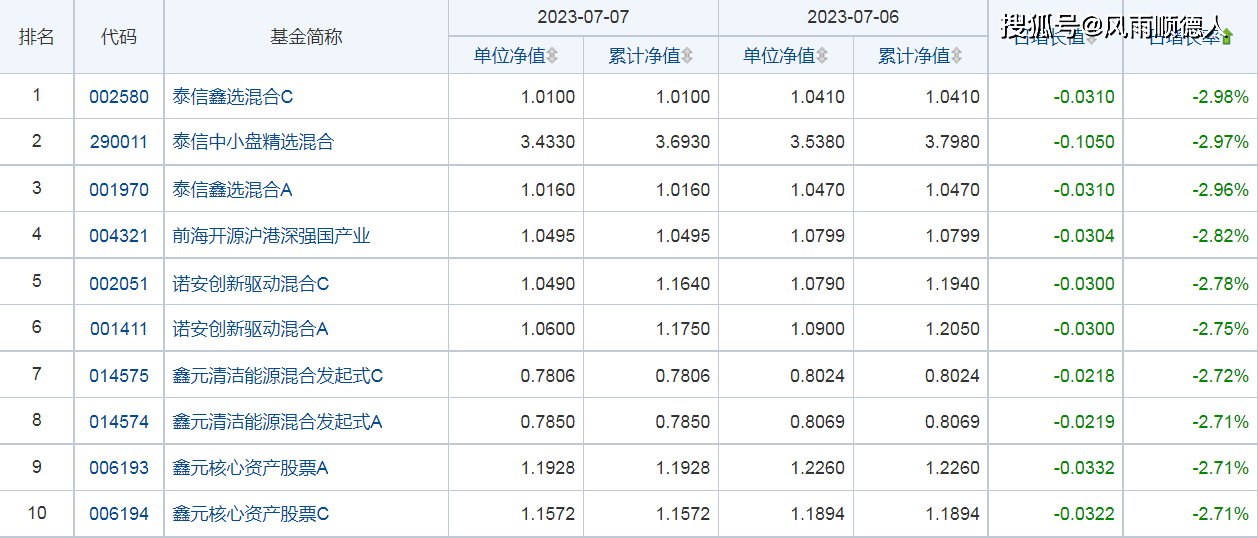 7日开放式基金净值增长排名后10的基金分别是:泰信鑫选混合C、泰信中小盘精选混合、泰信鑫选混合A、前海开源沪港深强国产业、诺安创新驱动混合C、诺安创新驱动混合A、鑫元清洁能源混合发起式C、鑫元清洁能源混合发起式A、鑫元核心资产股票A、鑫元核心资产股票C。