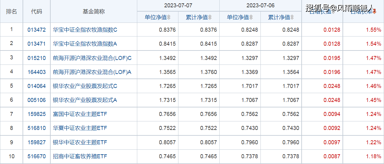 7日开放式基金净值增长排名前10的基金分别是:华宝中证全指农牧渔指数C、华宝中证全指农牧渔指数A、前海开源沪港深农业混合(LOF)C、前海开源沪港深农业混合(LOF)A、银华农业产业股票发起式C、银华农业产业股票发起式A、富国中证农业主题ETF、华夏中证农业主题ETF、银华中证农业主题ETF、招商中证畜牧养殖ETF。
