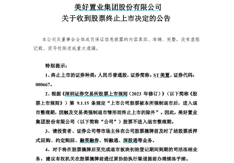 7月7日晚间,ST美置发布公告称,公司收到深交所《关于美好置业集团股份有限公司股票终止上市的决定》(深证上〔2023〕590号),深交所决定终止公司股票上市。