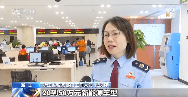 浙江省税务工作人员 张灵津:今年前五个月,我们全省新能源车辆购置税免征49.63亿元,同比增长54.4%。20到50万元的新能源车型,数量占比超过40%,消费升级趋势明显。