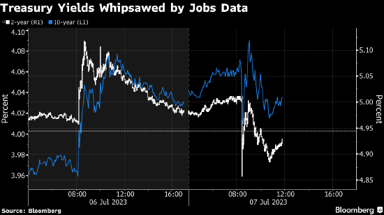 2年期和5年期收益率在加息预期带动下周四涨至2007年以来最高点,非农就业数据发布后,债券价格一度获得提振,因为新增就业一年多以来首次低于经济学家预测。