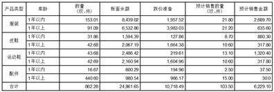 截至2023年6月30日,公司制定尾货处理定价规则,约定经销商提取尾货折扣,其中2021年四季产品按相应折扣,2022年四季相应折扣,2023年春相应折扣,公司区分一年以内和一年以上产品,预估出今年尾货销售情况,具体如下表所示: