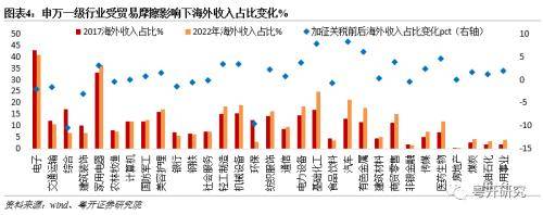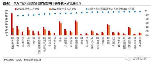 从A股上市公司角度来看,我们通过对比2017年年报和2022年年报披露的海外收入占比变化,衡量各行业受贸易摩擦影响程度,对申万行业进行梳理,一级行业中电子、交通运输、综合、建筑装饰、环保受到负面影响较大,若中美贸易关系进一步改善,上述板块边际修复空间较大。