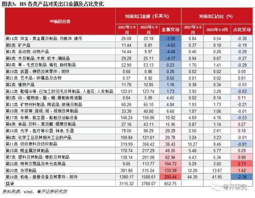 从对美出口金额方面来看,我们选取了2023年1-9月HS各行业对美出口金额和加征关税前(2017年1-9月对美出口金额)进行对比。中美贸易摩擦加剧后第14类珠宝、贵金属及制品;仿首饰;硬币、第5类矿产品、第1类活动物;动物产品、第9类木及制品;木炭;软木;编结品的对美出口金额均出现下滑。从出口结构方面来看,第16类机电、音像设备及其零件、附件、第11类纺织原料及纺织制品、第12类鞋帽伞等;已加工的羽毛及其制品;人造花;人发制品、第17类车辆、航空器、船舶及运输设备的出口比重下降较多,受到加征关税冲击明显,美国对上述产品依赖度有所下降。
