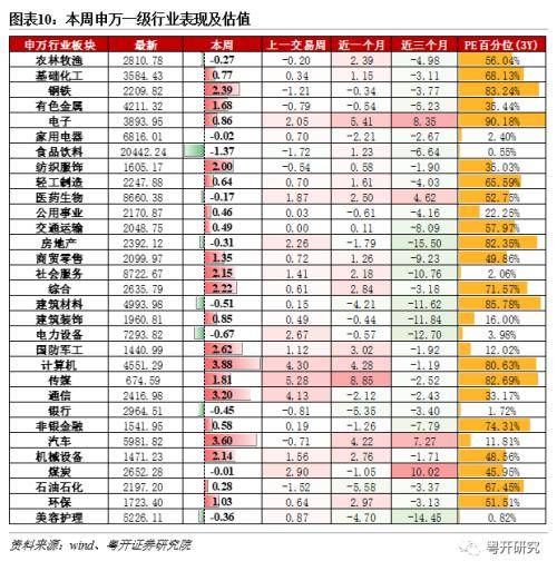 从盘面上来看,本周周期和成长风格占优,消费板块表现不佳。本周周期和成长风格领涨,周涨幅分别为1.66%和1.32%,消费板块表现不佳,与披露的相关经济数据偏弱有关。行业方面,31个申万一级行业涨多跌少,计算机、汽车、通信、国防军工、钢铁表现占优,食品饮料跌幅居前,当前需求端仍有待提振。从换手率来看,本周交易热度排名前五的行业为计算机、传媒、汽车、电子、通信。