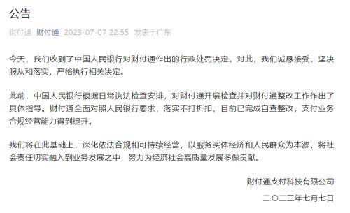 财付通回应央行行政处罚决定:诚恳接受、坚决服从和落实,严格执行相关决定。