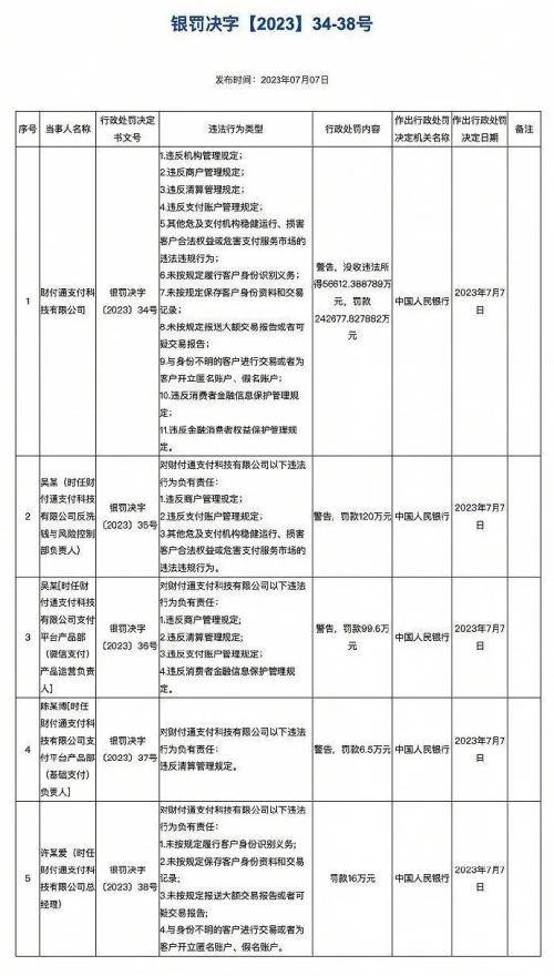 时任财付通支付科技有限公司反洗钱与风险控制部负责人吴某被罚款120万元;时任财付通支付科技有限公司支付平台产品部(微信支付)产品运营负责人吴某被罚款99.6万元;时任财付通支付科技有限公司支付平台产品部(基础支付)负责人陈某博被罚款6.5万元;时任财付通支付科技有限公司总经理许某爱被罚款16万元。