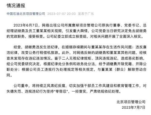中国石油北京项目管理公司7月7日晚发布情况通报,2023年6月7日,网络出现公司所属寰球项目管理公司原执行董事、党委书记、总经理胡继勇及员工董某某相关视频,引发重大舆情,公司党委当日研究决定免去胡继勇的党政职务,接受核查。公司纪委立即成立核查组,对相关问题开展了全面深入核实。经查,胡继勇违反生活纪律,在婚姻存续期间与董某某存在生活作风问题;违反廉洁纪律,改变公务行程借机旅游。此外,对网络反映的胡继勇和董某某其他问题,经核查未发现存在违纪违法情况。鉴于二人无视纪律规矩、顶风违规违纪,造成恶劣影响,经公司党委研究决定,根据纪律处分条例和政务处分法,给予胡继勇开除党籍、开除公职处分;根据公司员工违规行为处理规定等相关规定,与董某某(群众)解除劳动合同。
