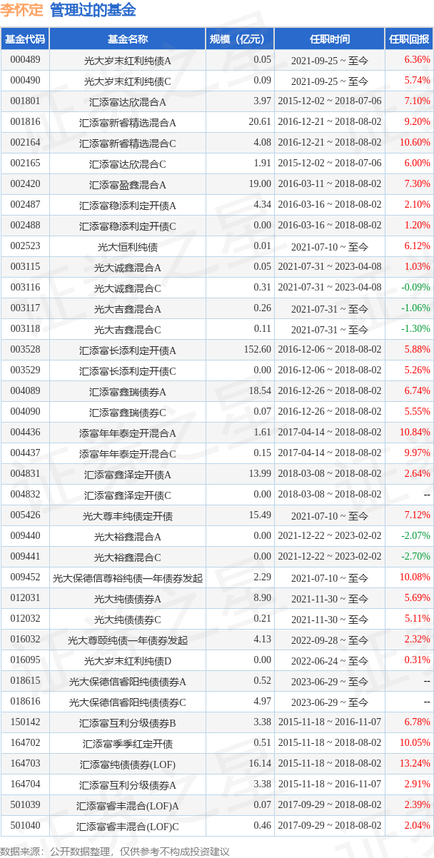 李怀定先生:中国国籍,复旦大学经济学博士学位。2007年7月至2007年11月任职华泰证券股份有限公司固定收益部;2007年11月至2009年7月在光大证券股份有限公司担任债券分析师;2009年7月至2012年5月在国信证券股份有限公司担任经济研究所高级分析师;2012年5月至2018年8月在汇添富基金管理股份有限公司历任固定收益投资部高级分析师、债券基金经理助理、债券基金经理;2018年8月至2021年5月在长江养老保险股份有限公司担任养老保障投资部/个人养老金投资部固收投资经理;2021年6月加入光大保德信基金管理有限公司,现任固收管理总部固收研究团队联席团队长,2021年7月至今担任光大保德信恒利纯债债券型证券投资基金、光大保德信尊裕纯债一年定期开放债券型发起式证券投资基金、光大保德信尊丰纯债定期开放债券型发起式证券投资基金、光大保德信吉鑫灵活配置混合型证券投资基金的基金经理,2021年7月至2023年4月担任光大保德信诚鑫灵活配置混合型证券投资基金的基金经理,2021年9月至今担任光大保德信岁末红利纯债债券型证券投资基金的基金经理,2021年11月至今担任光大保德信纯债债券型证券投资基金的基金经理,2021年12月至2023年3月担任光大保德信裕鑫混合型证券投资基金(已清盘)的基金经理,2022年9月至今担任光大保德信尊颐纯债一年定期开放债券型发起式证券投资基金的基金经理。