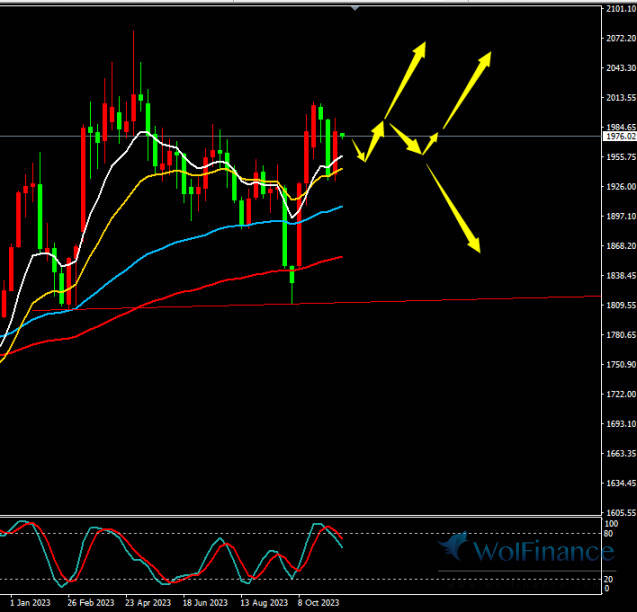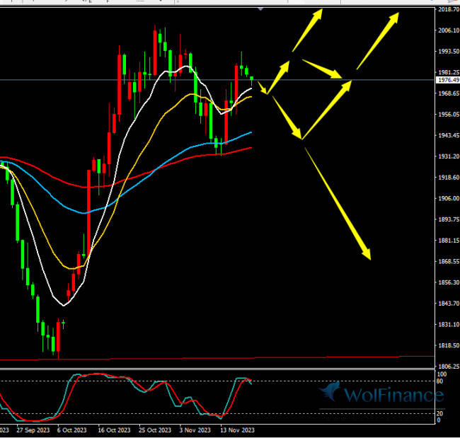 日线上,黄金日线收带上下影线小小阴线,目前处于短期线附近及上方运行,5日与10日均线仍向上运行,中期线向上运行,KDJ死叉向下运行,指标偏空。黄金在大格局上看,而一旦突破2076将打开上方空间,按空间算最少也应该冲击2200附近及上方。