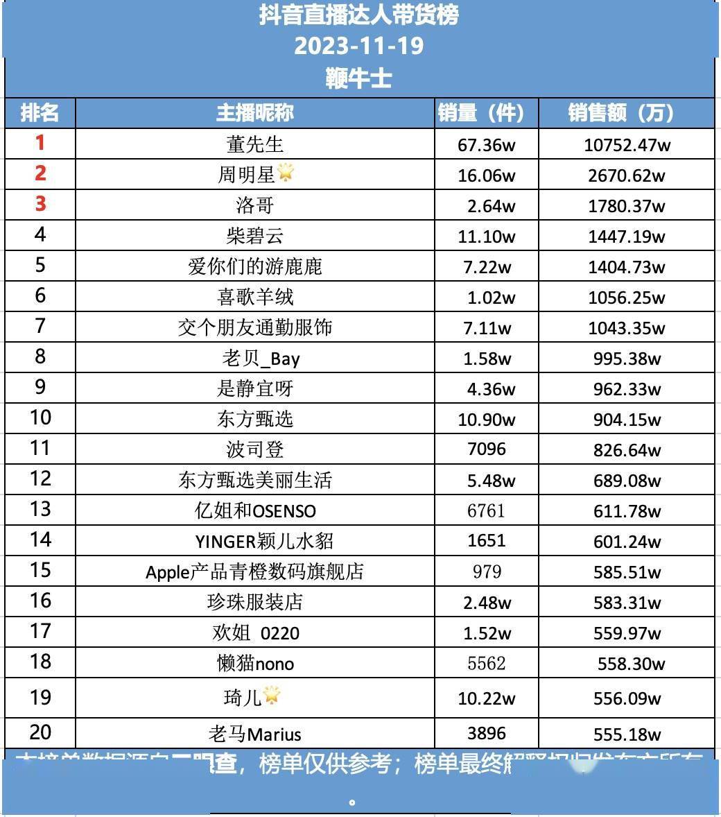 原标题:19号直播带货日榜:抖音董先生销售额破亿,快手栋梁销售第一
